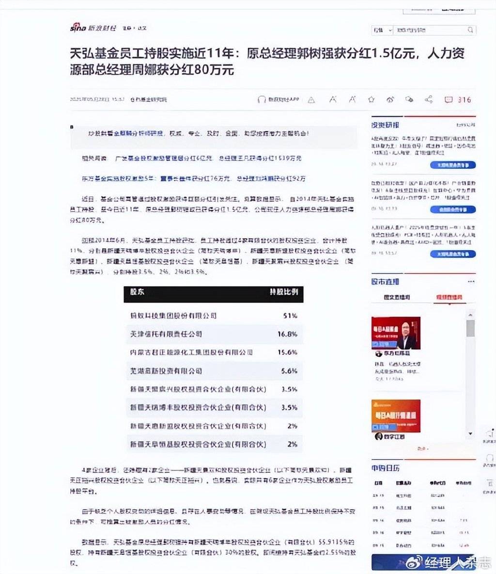 公开资料显示,郭树强通过两家员工持股平台间接持有天弘基金约2.55%股权,仅在2014 - 2022年间就获得超1.5亿元分红。与之形成鲜明对比的是,人力资源部总经理周娜同期仅获80万元分红,凸显出利益分配的极度不均衡。