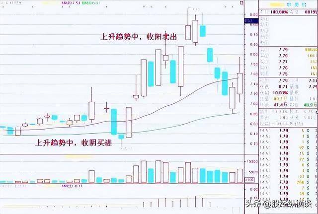 这一口诀与第一诀有点类似,就是讲逆市而动的道理,第一诀是说短线的,第二诀是说中线的。即,买时,选择K线收阴线时买;卖时,选择K线收阳线时卖。