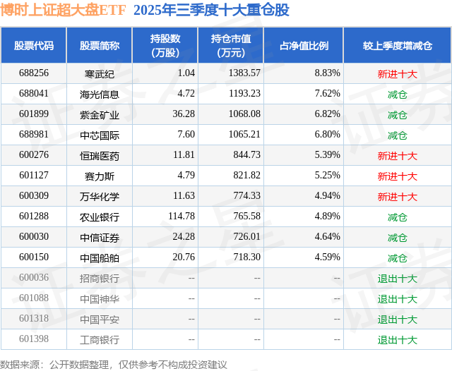 从基金规模来看,博时上证超大盘ETF基金2025年三季度公布的基金规模为1.57亿元,较上一期规模1.47亿元变化了965.04万元,环比变化了6.57%。该基金最新一期资产配置为:股票占净值比99.26%,无债券类资产,现金占净值比0.85%。从基金持仓来看,该基金当季前十大股票仓位达59.77%,第一大重仓股为寒武纪(688256),持仓占比为8.83%。