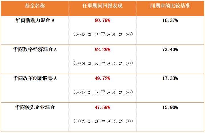 文中任职回报数据由托管行复核,业绩比较基准数据来自万得信息。华商新动力混合C任职回报(2023)为43.59%,同期业绩比较基准表现20.56%。华商改革创新股票C任职回报(2023)为46.60%,同期业绩比较基准表现17.33%。华商数字经济混合C任职回报(2024)为93.01%,同期业绩比较基准表现73.43%。