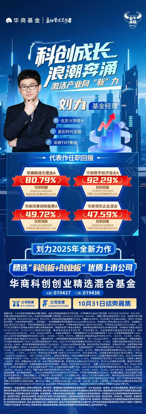 数据说明:华商科创创业精选混合基金的募集期为2025年10月13日至2025年10月31日。本基金的具体投资比例和投资策略详见基金法律文件。截至2025年9月30日,刘力具有9.2年证券从业经历(5.3年证券研究经历,3.9年证券投资经历)。历任基金——华商策略精选灵活配置混合20211026至20230105、华商新动力混合A类20220519至今、华商新动力混合C类20230220至今、华商改革创新股票A/C类20230110至今、华商数字经济混合A/C类20240625至今、华商领先企业混合20250106至今。文中基金经理关注的投资方向,仅为结合当前市场情况作出的判断,可能随市场情况调整,具体投资策略详见基金法律文件。