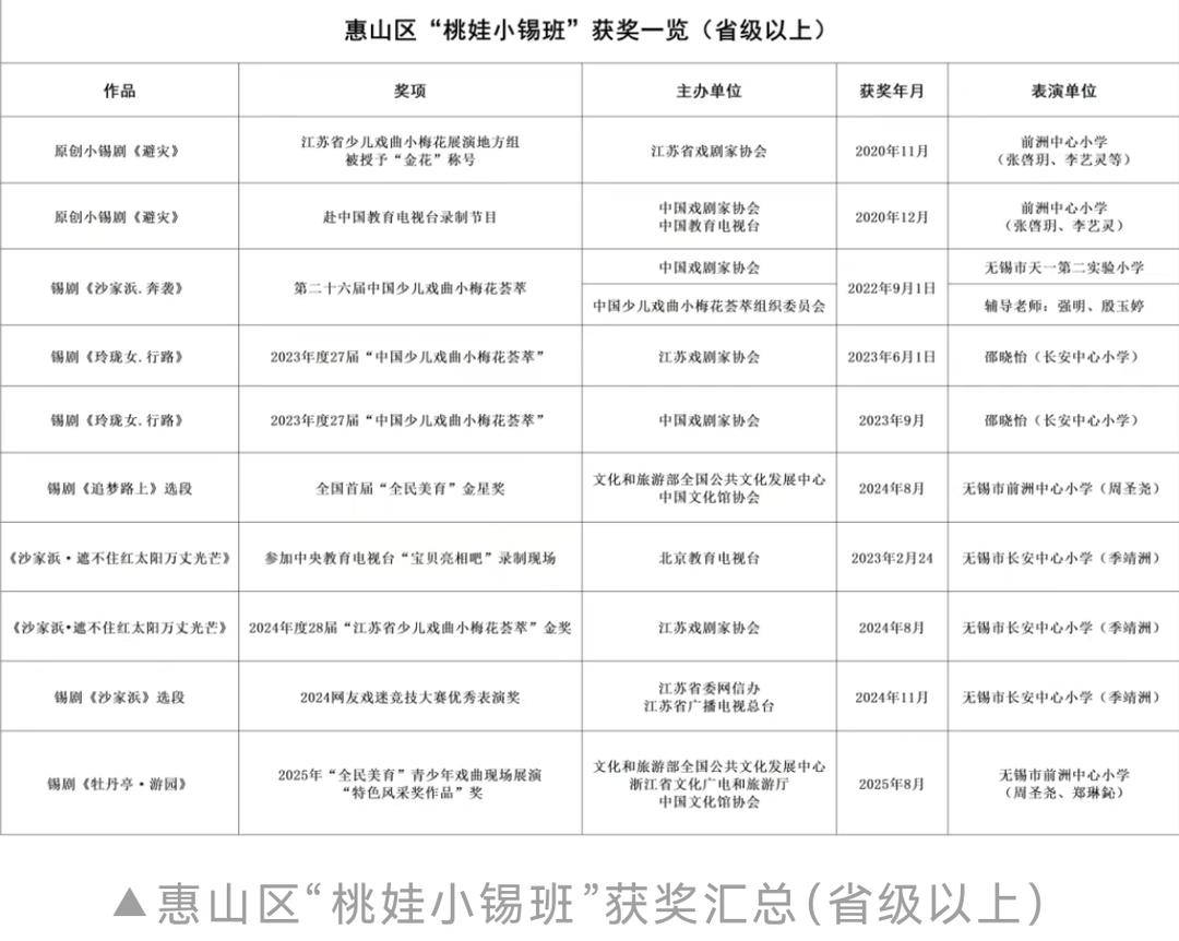 自2019年起,惠山区推进“锡剧进校园”工程,目前已有9所学校开设“桃娃小锡班”,每年超300名学生接受专业培训,一批锡剧好苗子就此崭露头角:前洲中心小学周圣尧获全国美育金星奖;天一第二实验小学的《沙家浜·奔袭》拿下“全国小梅花集体节目”奖;张棨玥斩获全国少儿“小梅花奖”;更有学员登上央视《一堂好戏》《宝贝 亮相吧》舞台。这项校园工程不仅提升了学生的艺术素养,让孩子们从小根植文化自信,更给锡剧这一国家级非遗注入“源头活水”。