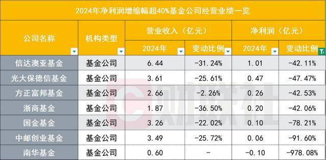 而榜单的另一端,7家公司去年净利润同比缩水超过四成。去年出现亏损的南华基金,亏损金额为1048.51万元,较2023年的119.41万元缩水978.08%。