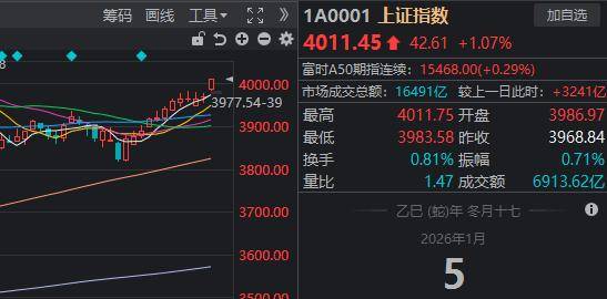 2026-01-05博鱼体育,博鱼体育官方网站,博鱼体育APP下载1月5日早盘,市场高开高走。时隔34个交易日,上证指数盘中重回4000点。截至收盘,沪指涨1.07%,深成指涨1.87%,创业板指涨2.15%。
