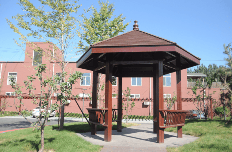 主楼共三层,二层、三层为病房,一层为医生办公、行政区域及活动室、会议室,整体设计古色古香,充满中国古典园林特色,小桥流水、花台鱼池、廊檐石阶、古钟佛像错落其间,环境清幽雅致,置身其中,丝毫感受不到医院的冰冷,更像是一座静谧的疗养院,让长者在舒适、温馨的环境中度过晚年。