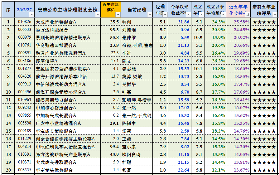 [注]: 白色底纹为本周新入榜。评星仅供参考,详细基金研究请关注基金研究评级专栏
