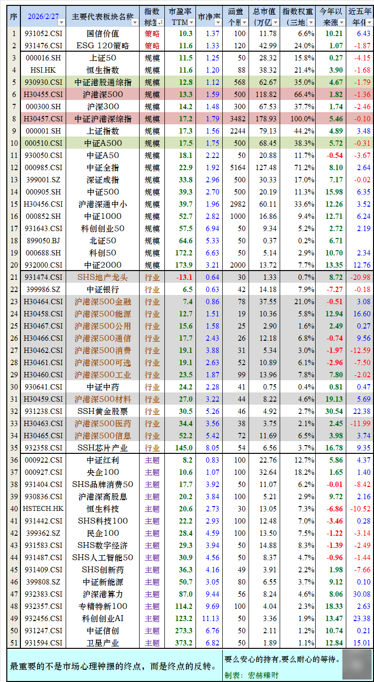 备注:当前表中包括18个规模指数,15个行业指数、16个主题投资指数和2个策略指数。旨在为投资者列出对于投资有实际参考意义(可投资相关指数基金)的各类指数的动态估值,为投资者资产配置助力参考。详见→指数巡礼