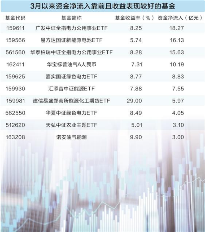 截至3月13日,3月以来能源类主题基金成最大赢家:南方原油A区间回报34.51%,易方达原油A人民币、嘉实原油紧随其后,收益率均超33%;煤炭板块中,国泰中证煤炭ETF回报9.63%,富国、国联旗下同类基金收益率超9%;电力领域,国泰国证绿色电力ETF、易方达中证绿色电力ETF、南方中证全指电力公用事业ETF等基金收益率均超8%。农业主题基金同步走强,易方达基金、天弘基金、华夏基金等旗下的农业主题和粮食产业ETF,3月以来涨幅均超5%,资金涌入迹象明显。