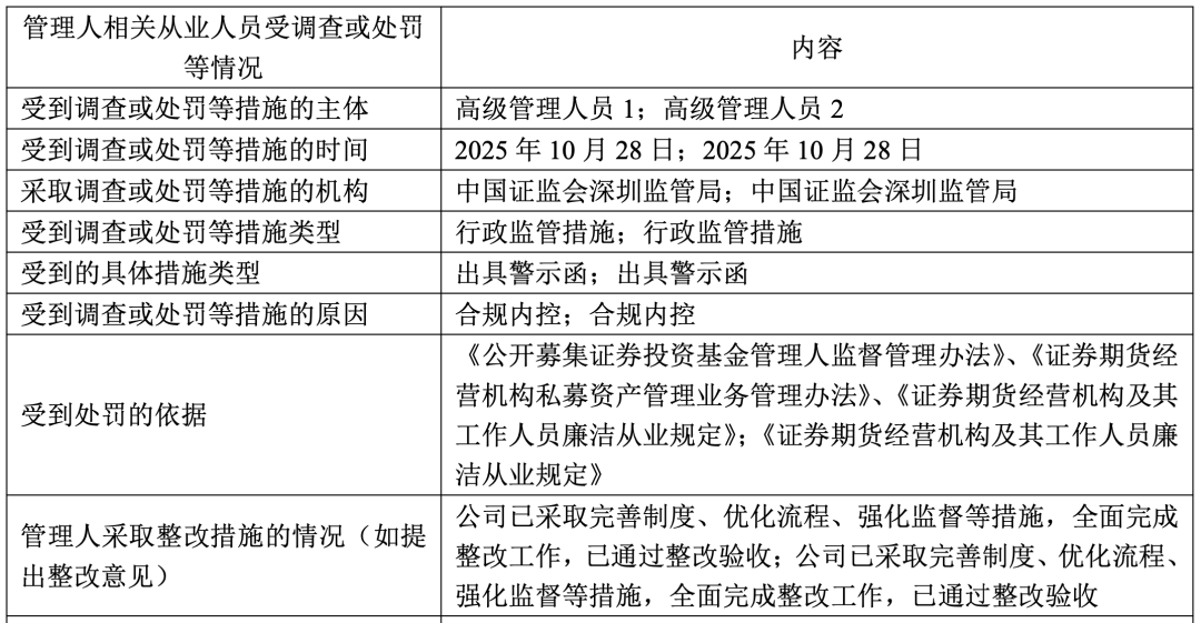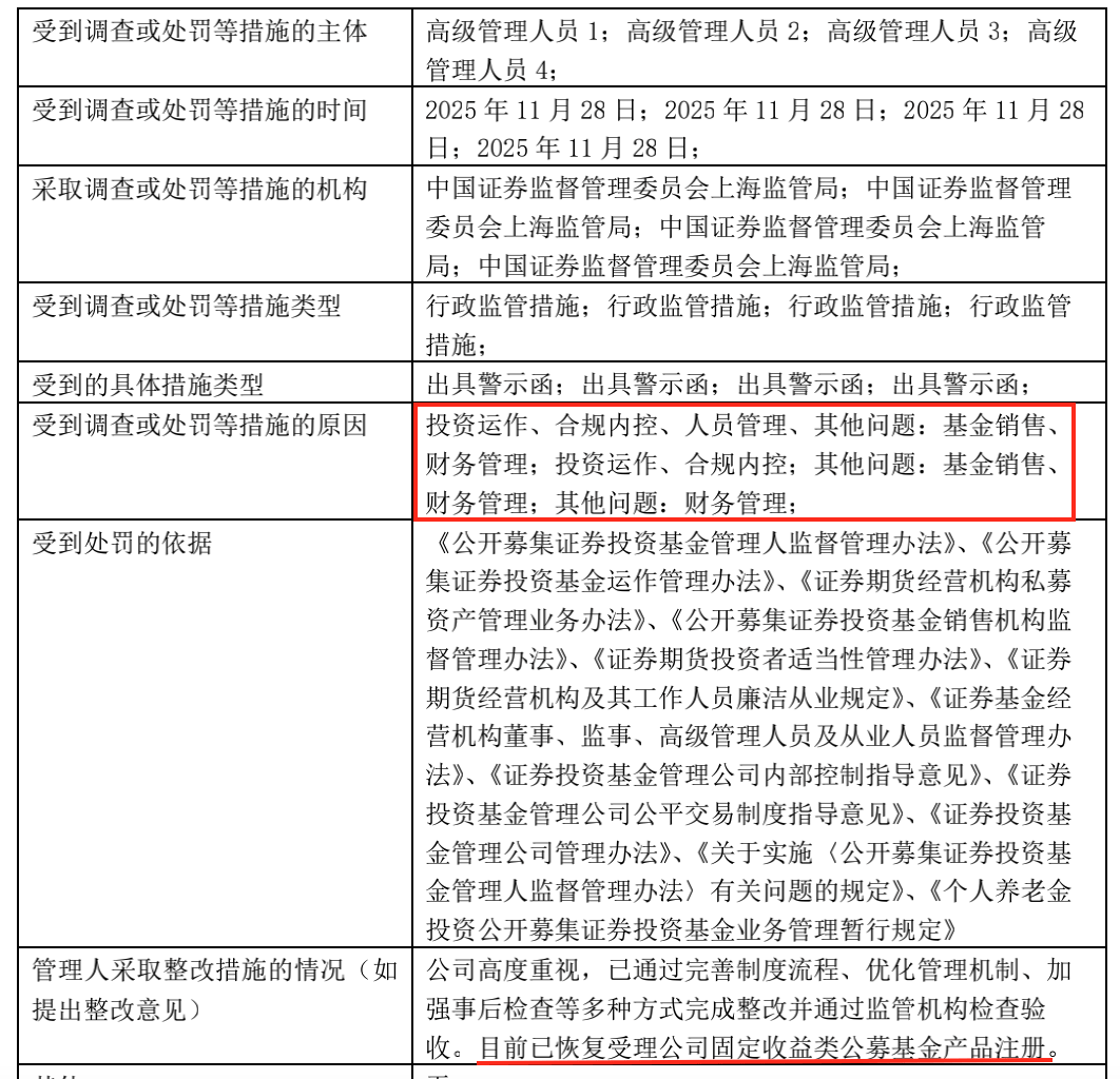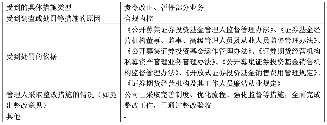 比如,长城基金也被暂停受理相关品类产品注册申请3个月,公司两名高管被采取监管谈话及出具警示函。