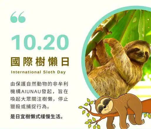 10月20日是国际树懒日,这个节日最早由位于哥伦比亚的AIUNAU基金于2010年发起,为的是让更多人去了解这个有独特步调的生物,并且尊重、爱护它们的生活栖息地。