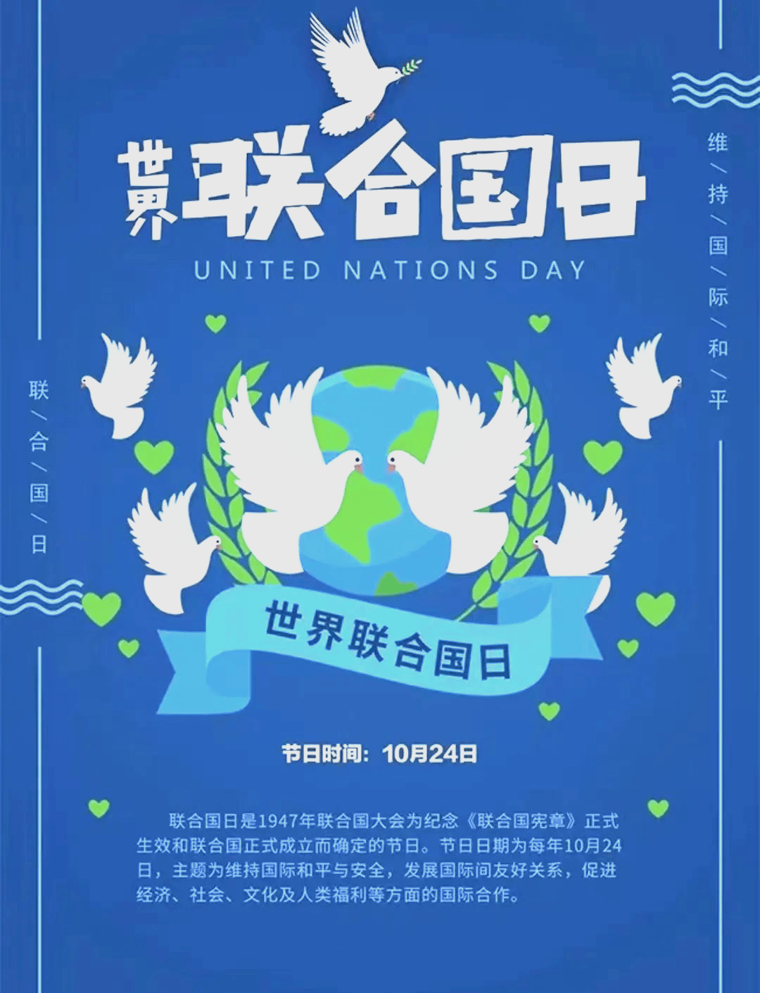 联合国日是每年10月24日举行的国际节日,旨在纪念1945年《联合国》生效及联合国正式成立,由联合国大会于1947年设立。该节日以维护和平安全、促进国际合作为宗旨,常规活动包括点亮标志性建筑和国际音乐会等。